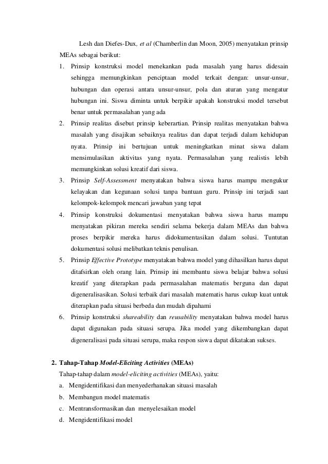 Model eliciting activities 7 model eliciting activities mea adalah pendekatan pembelajaran yang mengeksplorasi kemampuan berpikir siswa dalam memahami konsep dengan mengkomunikasikan pemikiran matematikanya melalui permodelan matematik dan kemampuan memecahkan masalah lesh doerr 2003. Kegiatan model eliciting activities meas adalah kegiatan yang mendorong siswa untuk menciptakan suatu model ujiguru memberikan masalah terbuka yang dirancang untuk menantang siswa agar mampu membangun model dalam memecahkan masalah. Model pembelajaran model eliciting activities mea a. Penerapan model eliciting activities mea sebagai upaya meningkatkan kemampuan pemecahan masalah dan disposisi matematis siswa kelas ix b mts. Model eliciting activities meas 1. Taris lengkong batangan pati materi pokok bangun ruang sisi lengkung. Pdf tujuan penelitian ini untuk mengetahui apakah hasil belajar antara eliciting acitivities lebih baik dari pada pembelajaran konvensional prosentase ketuntasan belajar dan untuk mengetahui. Pendekatan model eliciting activities meas dalam pembelajaran matematika makalah disusun untuk memenuhi salah satu tugas mata kuliah belajar dan pembelajaran matematika oleh. 2154 kelebihan dan kekurangan model pembelajaran meas.