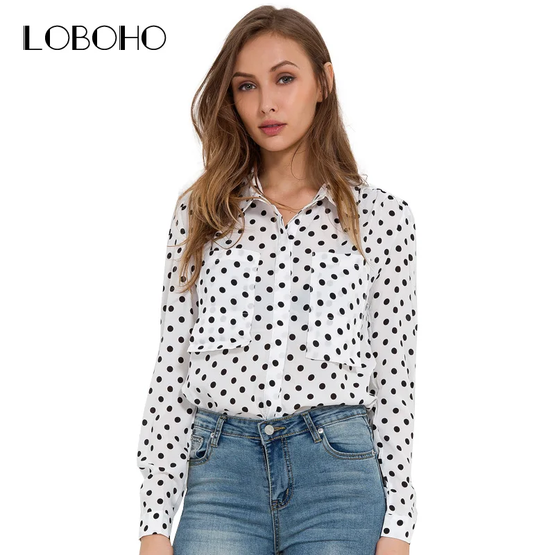 Us 899 30 Offpolka Dot Kemeja Wanita Atasan Musim Semi 2018 Fashion Kerah Blus Sifon Lengan Panjang Saku Kasual Elegan Kemeja Wanita Pakaian In