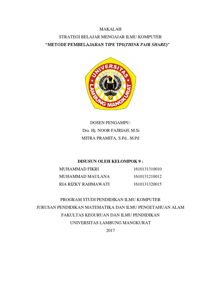 Rincian jelas mengenai Makalah Model Pembelajaran Kooperatif Tipe Tps.
