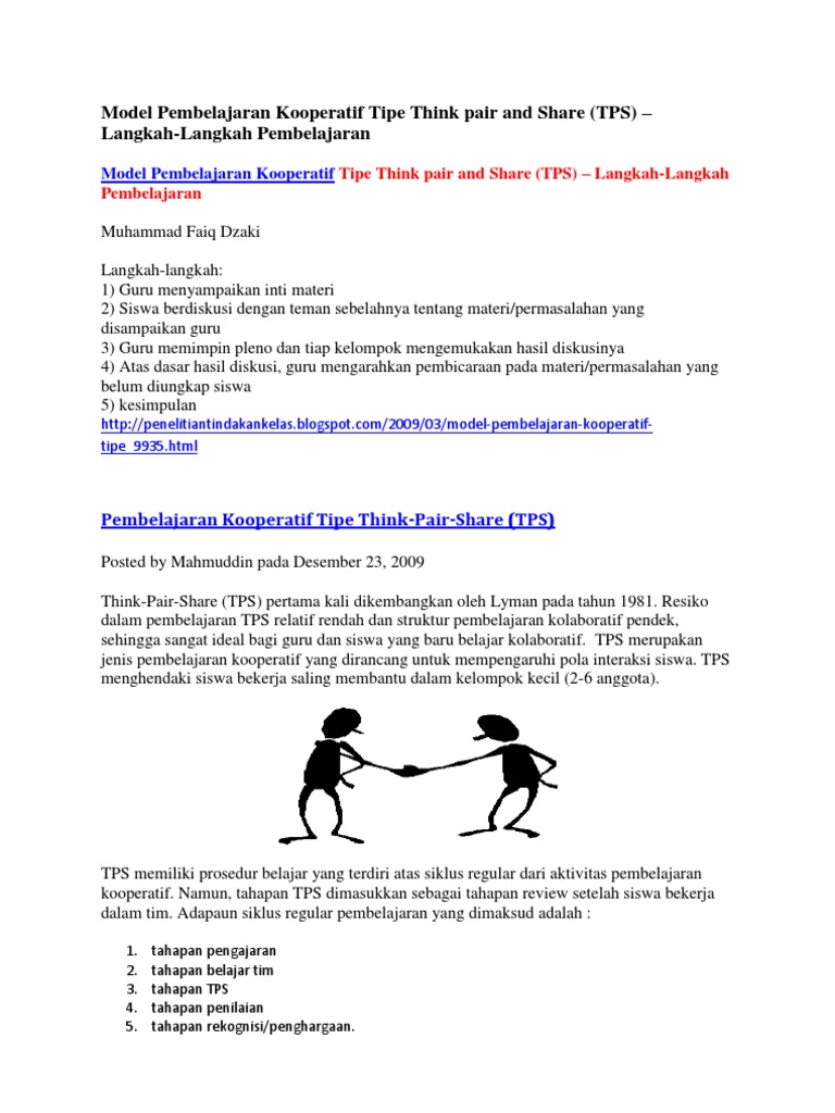 Model pembelajaran kooperatif think pair share. Tps menghendaki siswa bekerja saling membantu dalam kelompok kecil 2 6 anggota dan lebih dirincikan oleh penghargaan koopera t if dari pada penghargaan individual ibrahim dkk. Model ini pertama kali dikembangkan oleh frank lyman dari universitas maryland pada tahun 1985 think pair share sebagai struktur kegiatan pembelajaran gotong royaong. Tps think pair share atau berfikir berpasangan berbagi merupakan jenis pembelajaran kooperatif yang dirancang untuk mempengaruhi pola interaksi siswa. Model pembelajaran kooperatif tipe think pair share dilandasi oleh teori belajar konstruktivisme. Karakteristik pembelajaran think pair and share. Model think pair share tumbuh dari penelitian pembelajaran kooperatif model think pair share dapat juga disebut sebagai model belajar mengajar berpasangan. Salah satu model pembelajaran kooperatif yang dapat dipilih agar belajar menjadi suatu hal yang menyenangkan adalah model pembelajaran think pair and sharemodel pembelajaran ini dirancang untuk mempengaruhi pola interaksi siswa bersama pasangan kelompoknya untuk merumuskan jawaban dari pertanyaan yang telah diajukan guru. Ciri utama pada model pembelajaran kooperatif tipe think pair share adalah tiga langkah utamanya yang dilaksanakan dalam proses pembelajaran yaitu langkah think berpikir secara individual pair berpasangan dengan teman sebangku dan share berbagi jawaban dengan pasangan lain atau seluruh. Kegiatan berpikir berpasangan berbagi dalam model pembelajaran kooperatif think pair share tps memberikan banyak keutungan. Berpikir thinking guru mengajukan suatu pertanyaan atau masalah yang dikaitkan dengan pelajaran dan meminta peserta didik menggunakan waktu beberapa menit untuk berpikir sendiri jawaban atau masalah. Pengertian model pembelajaran beragam gaya mengajar yang dilakukan dengan khas oleh masing masing guru di kelasnya dalam melaksanakan kegiatan pembelajaran.