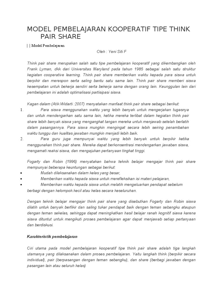 Model pembelajaran kooperatif think pair share. Tps menghendaki siswa bekerja saling membantu dalam kelompok kecil 2 6 anggota dan lebih dirincikan oleh penghargaan koopera t if dari pada penghargaan individual ibrahim dkk. Model ini pertama kali dikembangkan oleh frank lyman dari universitas maryland pada tahun 1985 think pair share sebagai struktur kegiatan pembelajaran gotong royaong. Tps think pair share atau berfikir berpasangan berbagi merupakan jenis pembelajaran kooperatif yang dirancang untuk mempengaruhi pola interaksi siswa. Model pembelajaran kooperatif tipe think pair share dilandasi oleh teori belajar konstruktivisme. Karakteristik pembelajaran think pair and share. Model think pair share tumbuh dari penelitian pembelajaran kooperatif model think pair share dapat juga disebut sebagai model belajar mengajar berpasangan. Salah satu model pembelajaran kooperatif yang dapat dipilih agar belajar menjadi suatu hal yang menyenangkan adalah model pembelajaran think pair and sharemodel pembelajaran ini dirancang untuk mempengaruhi pola interaksi siswa bersama pasangan kelompoknya untuk merumuskan jawaban dari pertanyaan yang telah diajukan guru. Ciri utama pada model pembelajaran kooperatif tipe think pair share adalah tiga langkah utamanya yang dilaksanakan dalam proses pembelajaran yaitu langkah think berpikir secara individual pair berpasangan dengan teman sebangku dan share berbagi jawaban dengan pasangan lain atau seluruh. Kegiatan berpikir berpasangan berbagi dalam model pembelajaran kooperatif think pair share tps memberikan banyak keutungan. Berpikir thinking guru mengajukan suatu pertanyaan atau masalah yang dikaitkan dengan pelajaran dan meminta peserta didik menggunakan waktu beberapa menit untuk berpikir sendiri jawaban atau masalah. Pengertian model pembelajaran beragam gaya mengajar yang dilakukan dengan khas oleh masing masing guru di kelasnya dalam melaksanakan kegiatan pembelajaran.