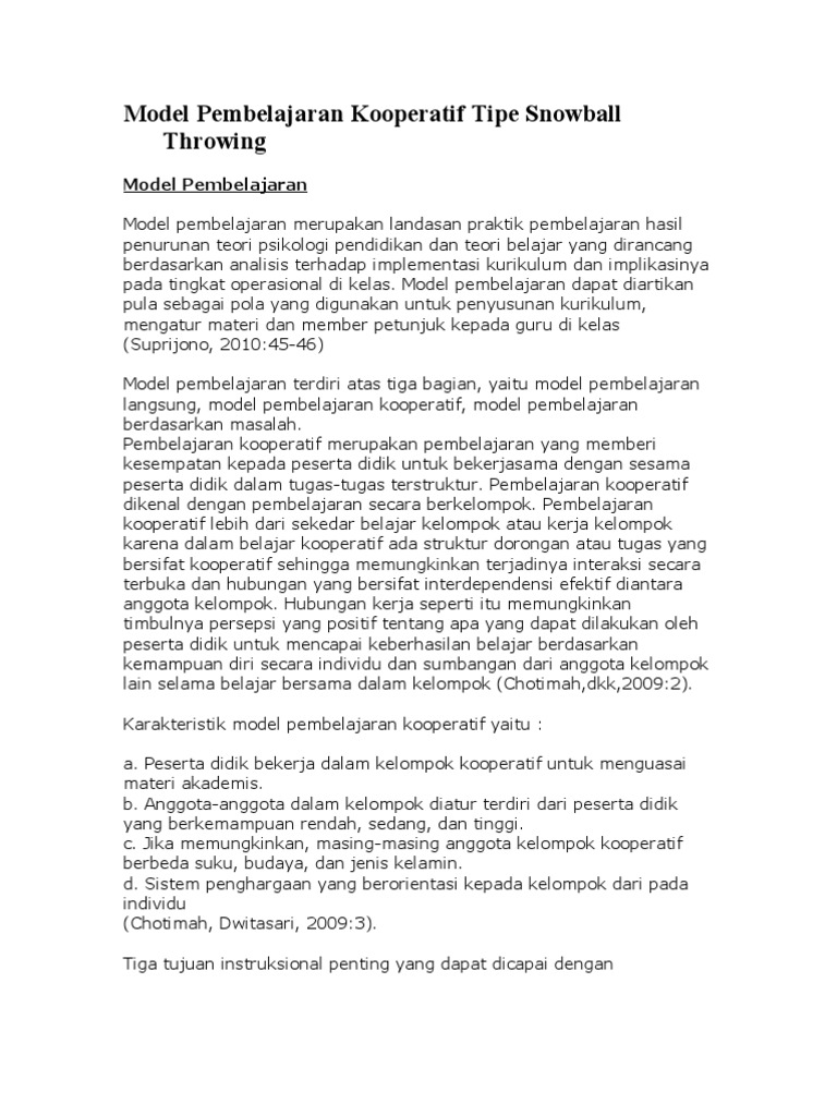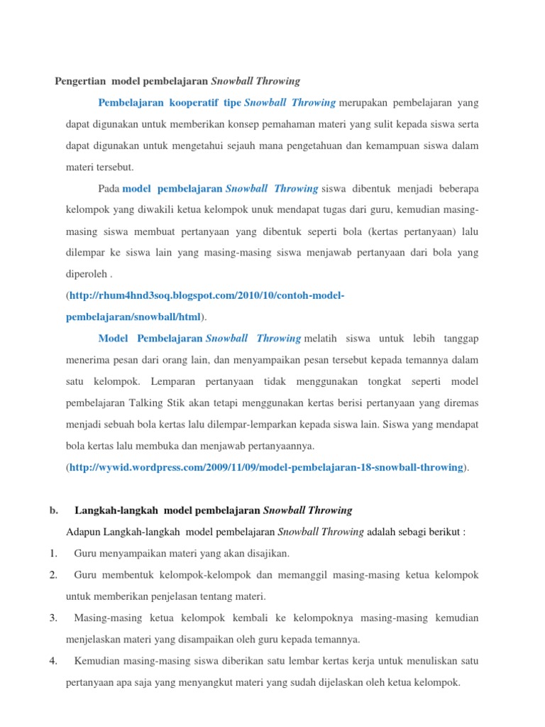 Pengertian model pembelajaran kooperatif tipe snowball. Tersebut dapat membuktikan bahwa penggunaan modelpembelajaran kooperatif tipe snowball throwingdapat berpengaruh terhadap prestasi maupun motivasi belajar siswa dalam mata pelajaran ipa di kelas iv sd negeri ajibarang kulon. Melalui penerapan model pembelajaran kooperatif tipe snowball throwing materitrigonometri pada siklus idengan perolehan skor 0 75 dalam kategori tidak tuntas dengan frekuensi 21 6563 dan 75 skor 100 dalam kategori tuntas dengan frekuensi 11 3437 dapat disimpulkan bahwa dalam siklus i belum tuntas dengan. Kekurangan model kooperatif tipe snowball throwing yaitu pengetahuan tidak luas hanya berkutat pada pengetahuan sekitar siswa dan kurang efektif.