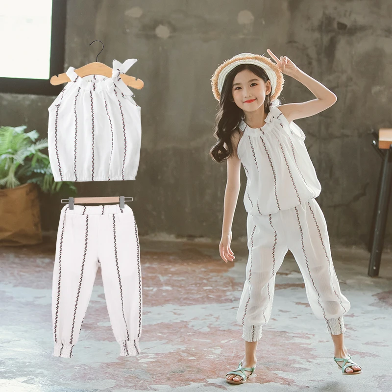 Remaja Perempuan Sifon Set 2019 Musim Panas Baru Merek Wanita Pakaian Putih Kartun Pendek Lengan T Shirt Kerudung Gaun 2 Pcs Anak Pakaian