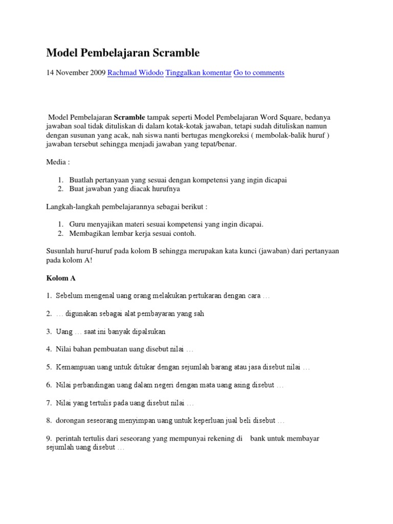 Model pembelajaran scramble menurut para ahli. Sintak alias langkah langkah pembelajaran scramble terdiri atas 7 fase yaitu. Modelpembelajaran stad dikembangkan oleh slavin dkkmodel pembelajaran stad merupakan salah satu model pembelajarankooperatif. 20 oktober 2018 add comment model. Pengaruh model pembelajaran kooperatif tipe scramble terhadap hasil belajar peserta didik mata pelajaran fisika pada topik listrik ac dc. Model pembelajaran scramble tampak seperti model pembelajaran word square bedanya jawaban soal tidak dituliskan di dalam kotak kotak jawaban tetapi sudah dituliskan namun dengan susunan yang acak peserta didik yang nanti bertugas mengkoreksi membolak balik huruf jawaban tersebut sehingga menjadi jawaban yang tepatbenar. Pengertian model pembelajaran kooperatif scramble model pembelajaran kooperatif scramble adalah pembelajaran secara berkelompok dengan mencocokkan kartu pertanyaan dan kartu jawaban yang telah disediakan sesuai dengan soal fadmawati2009. Tujuan penelitian adapun tujuan penelitian ini adalah. Konsep dan sintak pembelajaran scramble. Mengetahui aktivitas guru dan siswa selama mengikuti pembelajaran dengan penerapan model pembelajaran scramble. Sedangkan menurut soeparno 199860 berpendapat bahwa metode scramble adalah salah satu permainan bahasa pada hakikatnya permainan bahasa merupakan. Model pembelajaran s cramble merupakan model pembelajaran dengan metode m embagi k an lembar berisi soal dan lembar berisi jawaban. Bagaimana respon siswa terhadap model pembelajaran scramble pada materi tata nama senyawa di sman 1 bireuen.