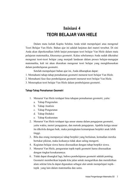 Dalam hal ini agar tujuan pembelajaran dapat tersampikn sesuai dengan waktu yang telah ditetapkan. Burger dan saughnessy 198647 melaporkan bahwa siswa menunjukkan tingkah laku yang konsisten dalam tingkat berpikir geometri sesuai dengan tingkatan berpikir van hiele. Susiswo 198977 menyimpulkan bahwa pembelajaran geometri dengan pembelajaran model van hiele lebih efektif daripada pembelajaran konvensional. 4 9 teori van hiele tidak hanya.