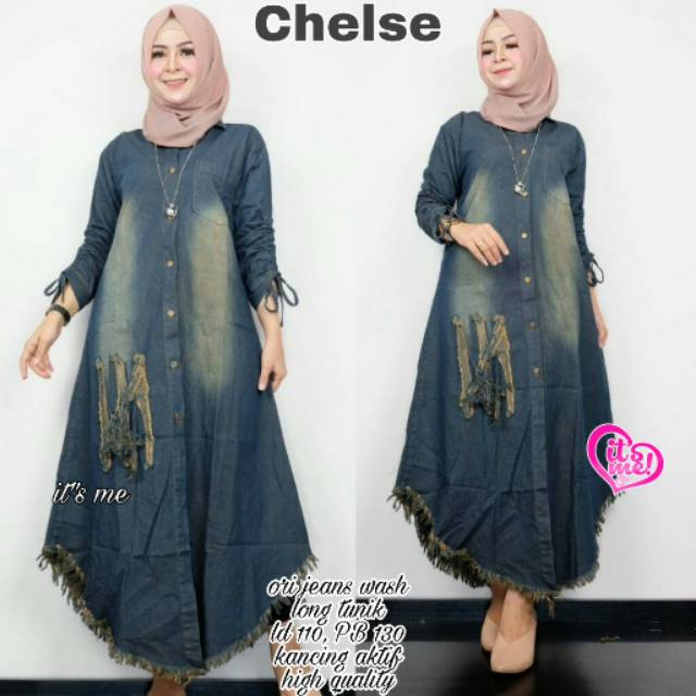 Long Tunik Bahan Ori Jeans Wash Kancing Depan Atasan Tunik Wanita Model Terbaru