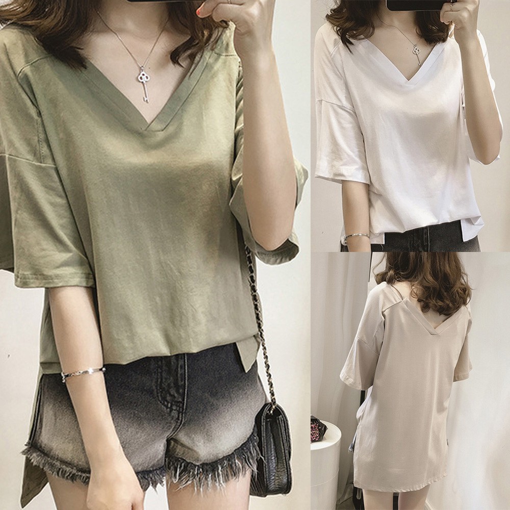 2017 Gaya Barat Musim Panas Model Baru Kerah V Longgar Terlihat Langsing Ukuran Besar Casual Baju Dalaman Sepatu Linen Kaos Wanita Lengan Pendek