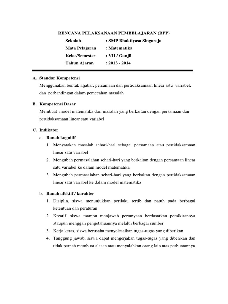 Rpp Kelas 7 Matematika Aljabar Lineardocx Docx Document