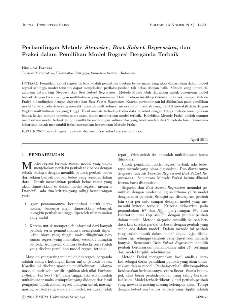 Pdf Pemilihan Model Regresi Terbaik Fausania Hibatullah
