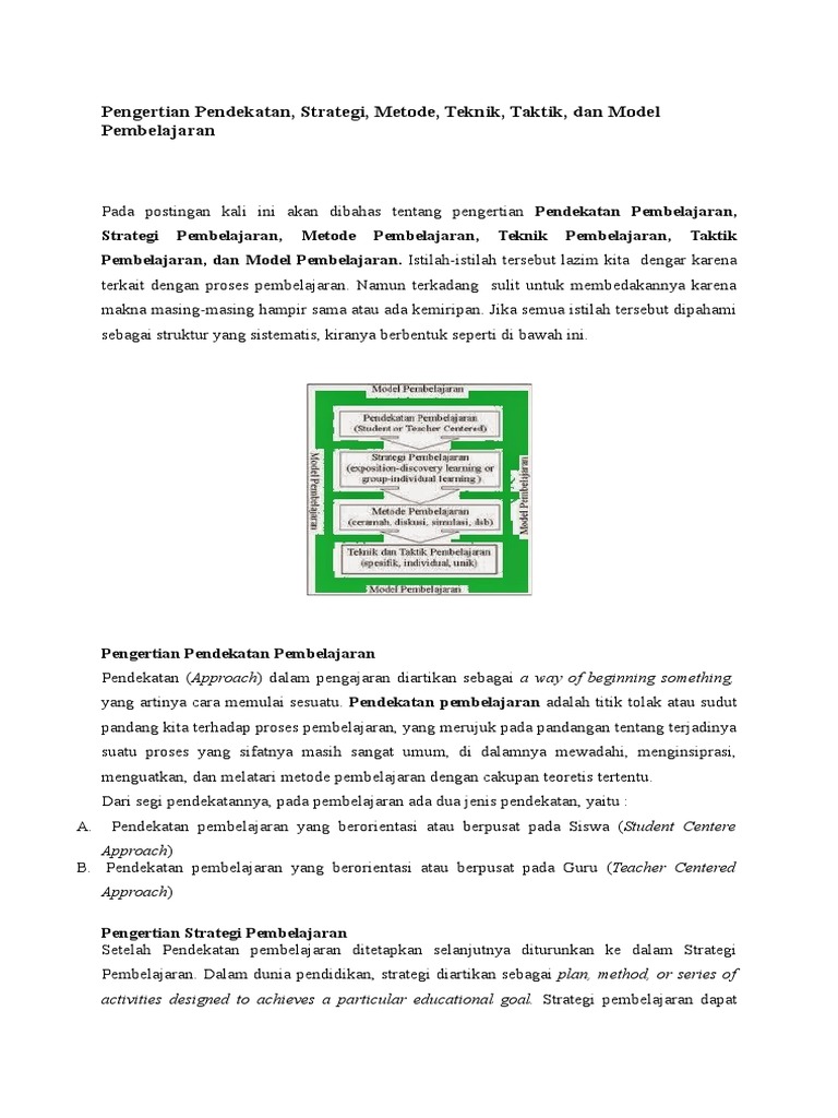 1 pendekatan pembelajaran 2 strategi pembelajaran 3 metode pembelajaran 4 teknik pembelajaran 5 taktik pembelajaran dan 6 model pembelajaran. Pendekatan strategi metode teknik taktik dan model pembelajaran merupakan istilah yang sering digunakan dalam dunia pendidikan. 1 pendekatan pembelajaran 2 strategi pembelajaran 3 metode pembelajaran 4 teknik pembelajaran 5 taktik pembelajaran dan 6 model pembelajaran. Model pembelajaran adalah bentuk pembelajaran yang tergambar dari awal sampai akhir yang disajikan secara khas oleh guru di kelas.
