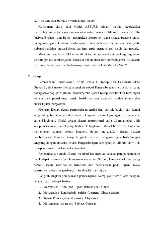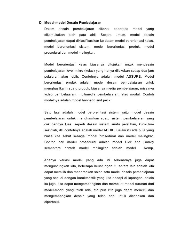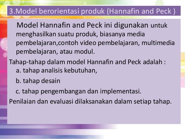 Satu lagi adalah model beroreintasi sistem yaitu model desain pembelajaran untuk menghasilkan suatu sistem pembelajaran yang cakupannya luas seperti desain sistem suatu pelatihan kurikulum sekolah dll. Fase ini diperlukan untuk mengidentifikasi kebutuhankebutuhan dalam mengembangkan suatu media. Model hannafin dan peck ialah model desain pengajaran yang terdiri dari pada tiga fase yaitu fase analisi keperluan fase desain dan fase pengembangan dan implementasi. Rancangan pengembangan bahan ajar model hannafin dan peck model hannafin dan peck adalah model desainp embelajaran yang terdiri dari pada tiga fase yaitu fase analisis keperluan fase desain fase pengembangan dan implementasi hannafin peck 1988. Model ini adalah model desain pembelajaran berorientasi produk. Fase pertama dari model hannafin dan peck adalah analisis kebutuhan. Model hannafin dan peck ialah model desain pengajaran yang terdiri daripada tiga fase yaitu fase analisis kebutuhan fase desain dan fase pengembangan dan implementasi. Gambar 3 model hannafin and peck. Dalam model ini disetiap fase akan dilakukan penilaian dan pengulangan. Selain itu ada pula yang biasa kita sebut sebagai model prosedural dan model melingkar. Secara mikro model pengembangan sistem pembelajaran yang berorientasi kelas biasanya ditujukan untuk mendesain pembelajaran level mikro kelas yang hanya dilakukan setiap dua jam pelajaran atau lebih. Deskripsi model model hannafin dan peck ialah model desain pengajaran yang terdiri daripada tiga fase yaitu fase analisis kebutuhan fase desain dan fase pengembangan atau implementasi.