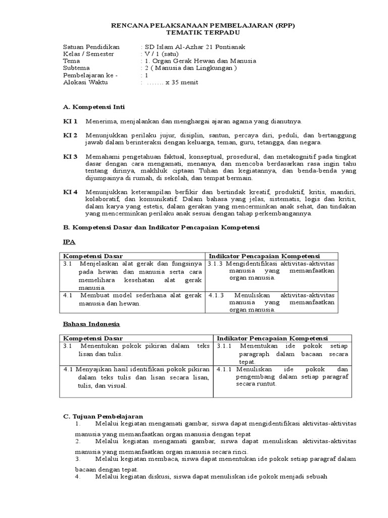 Rpp K13 Kelas 5 Tema 1 Organ Gerak Hewan Dan Manusia Revisi