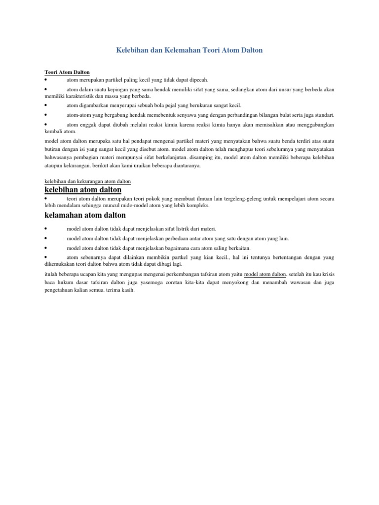 Kelebihan dan kelemahan model atom dalton. Bisa menjelaskan perbedaan unsur dan. Tidak dapat menjelaskan efek zeeman dan efek strack. Artikel ini membahas tentang kelebihan dan kelemahan teori atau model atom dalton thomson rutherford dan niels bohr lengkap. Menurut dalton atom tidak dapat dipisahkan dan senyawa tersusun ketika atom arom berikat. Ketika dalton mengajukan model ini pada tahun 1803 elektron dan nukleusnya belum ditemukan. Kelebihan teori atom dalton adalah dapat menjelaskan dengan baik hukum kekekalan massa dan hukum perbandingan tetap. Model atom dalton tidak dapat menjelaskan. Model atom dalton john dalton mengusulkan bahwa semua materi terdiri dari penyusun kecil yang ia sebut atom. Tidak dapat menjelaskan susunan muatan positif dan negatif dalam bola atom tersebut kelebihan model atom thomson a. Kelemahan model atom thomson a. Jelaskan kelebihan keunggulan dan kelemahan teori dan model atom dalton. Kelemahan model atom bohr a.